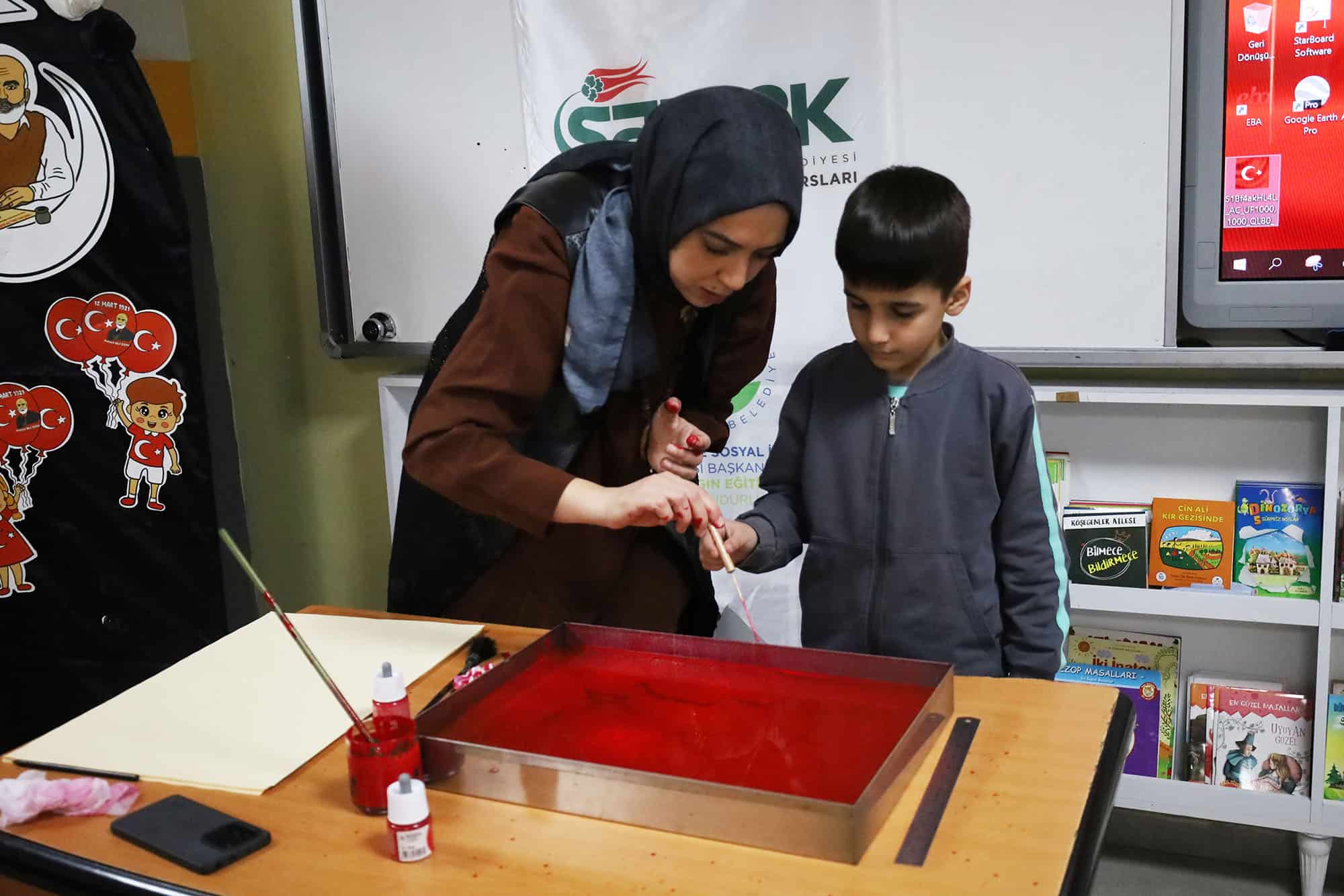 Anma programının ardından düzenlenen atölye çalışmasında öğrenciler, SAMEK eğitmenleri gözetiminde ebru sanatı ile tanıştı. Katılımcı öğrenciler, ebru tekniğiyle Türk bayrağı temalı eserler üreterek hem geleneksel sanatları deneyimleme fırsatı buldu hem de milli değerleri pekiştirdi.